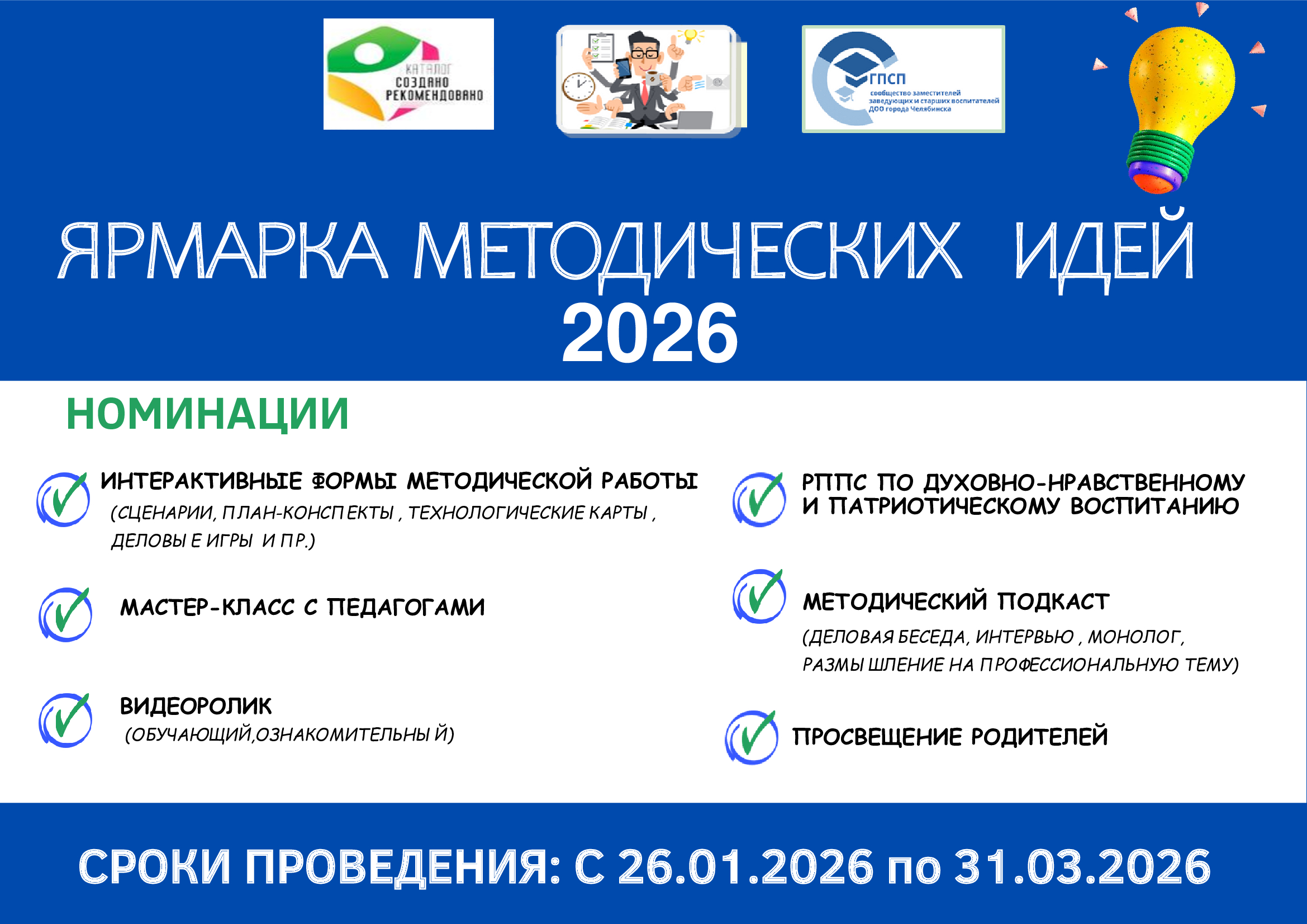 Ярмарка методических идей: новый творческий старт! Вот и настал тот день, когда заместители руководителей детских садов вновь готовы поделиться своими самыми яркими методическими находками. В год дошкольного образования Ярмарка методических идей приобретает особую значимость. Что такое ярмарка? Ярмарка методических идей — это своего рода праздник творчества и вдохновения среди старших воспитателей и методистов дошкольных образовательных учреждений. Здесь каждый заместитель руководителя может показать свою уникальность, представив оригинальные разработки, игровые методики и даже новые подходы к организации работы с педагогическим коллективом по самым разным направлениям. Но самое главное — это атмосфера, которая вдохновляет на создание настоящих методических шедевров. По итогам ярмарки будет создан новый сборник для заместителей руководителей и участников проекта 'Хочу руководить! "Представляйте на ярмарку свой материал http://forms.yandex.ru/cloud/6979... Так что, дорогие коллеги, готовьтесь удивлять и восхищать! Ведь ваша работа — это настоящее искусство, которое заслуживает внимания и признания. Каждый участник ярмарки получит сертификат.